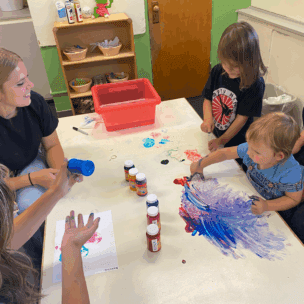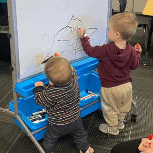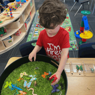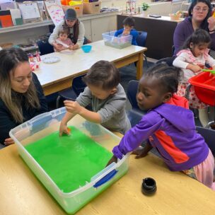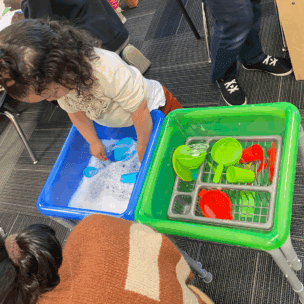The Play 2 Learn classroom is set up with different centers so families can choose their favorite activities. There’s an area for blocks, science, art, and dramatic play. The room contains sensory options, including sand and water, plus a library.